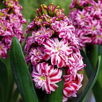 Гиацинт “Дабл Эрос” – эффектный, современный махровый сорт. Луковицы гиацинтов крупного размера, отлично приживаются в любых условиях, отличаются обильным и ранним цветением. Цветки собранны в пышные соцветия, ярко-розового цвета с широкой белой каймой. Растение невысокое, стебель прямостоячий, крепкий. Гиацинты получили огромную популярность из-за своей привлекательности, их выращивают в горшках в домашних условиях, в открытом грунте на клумбах, а также в воде.