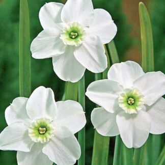 Растение среднего размера (до 45 см), с ярко-зелеными листьями. На верхушках цветоносов образуются очаровательные бутоны размером до 8 см. В распустившемся виде диаметр цветков равен 10 см. Лепестки окрашены в белоснежный цвет. Коронка пастельно-зеленая, невысокая (1/3 длины околоцветника). Период цветения начинается в апреле или мае, в зависимости от региона, и длится до 2 недель. Изящные цветы роскошно смотрятся в составе букетных композиций, в контейнерах, на клумбах и рабатках.