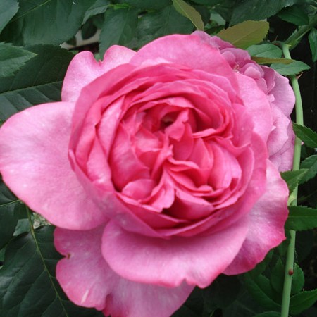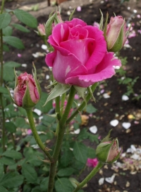 Куст вырастает не слишком большим. В высоту он достигает 1 – 1,2 м. Побеги ровные и прямые, хорошо удерживающие вес распустившихся соцветий. Бутоны аккуратной бокаловидной формы, махровые (состоят из 40 лепестков). Окрас цветка цикломеново-розовый, с белыми штрихами. Диаметр – около 10 см. Весь период цветения многолетник сохраняет отменные декоративные качества. Роза источает приятный и ненавязчивый аромат.
